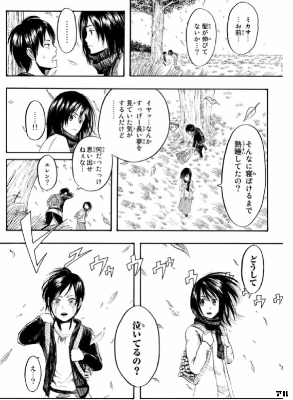 ミカサ お前 髪が伸びてないか そんなに寝ぼけるまで熟睡してたの イヤッ なんかすっげー長い夢を見ていた気がするんだけど 何だったっけ思い出せねぇな エレン どうして 泣いてるの え 進撃の巨人 アル